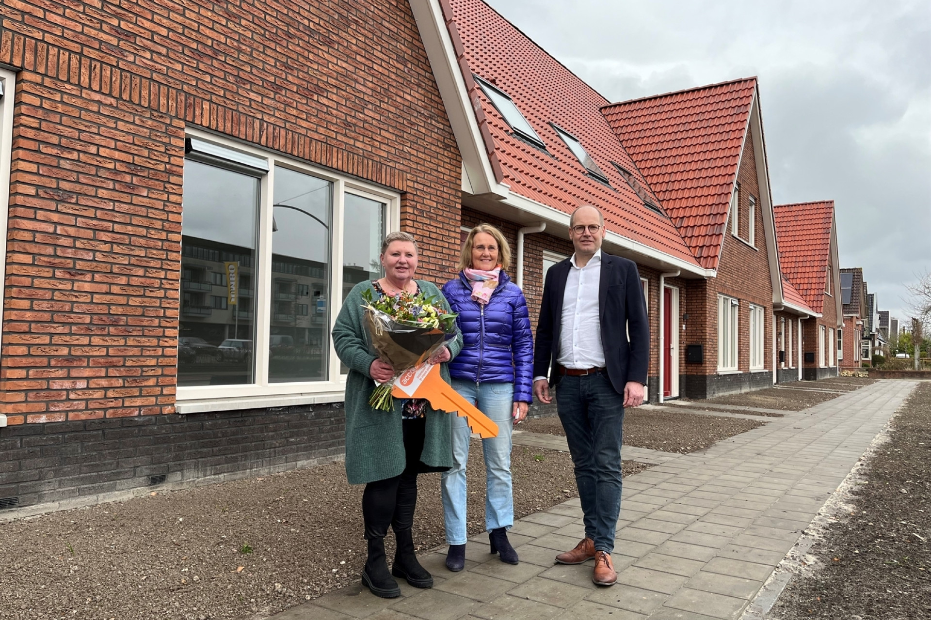 Op woensdag 27 maart ontving mevrouw Elzinga als eerste de sleutel van haar nieuwe woning aan de Stationsweg in Drachten. Ze kreeg de sleutel uit handen van Elze Klinkhammer, onze directeur-bestuurder en Jan van der Meer, algemeen directeur van aannemer VDM Woningen.
